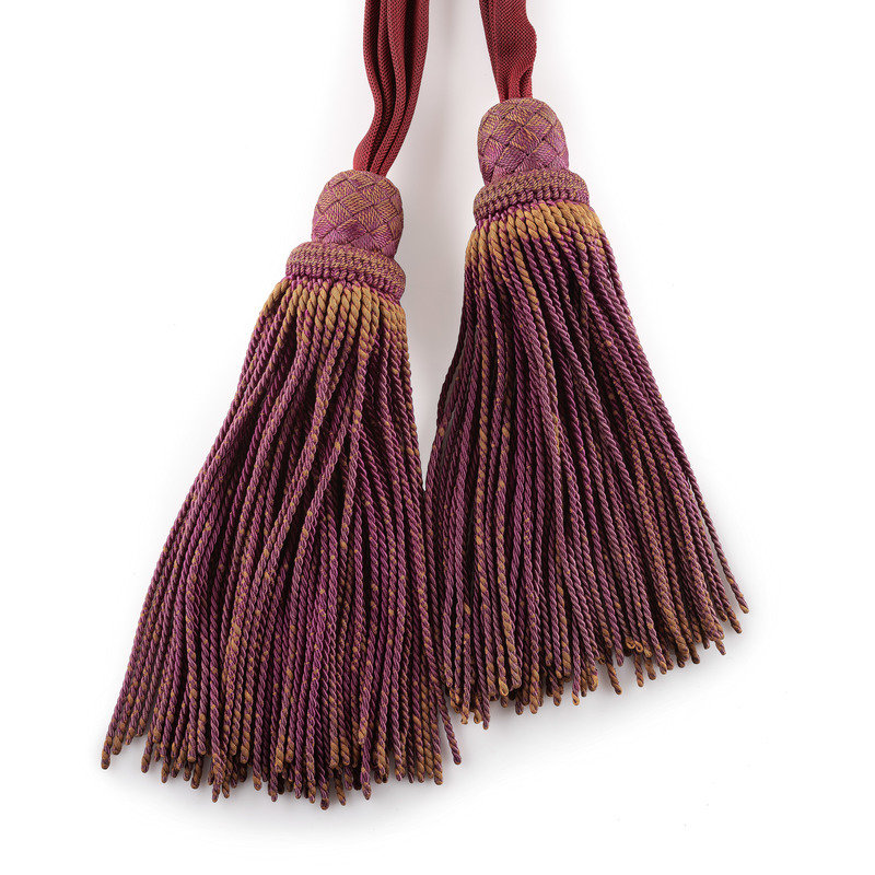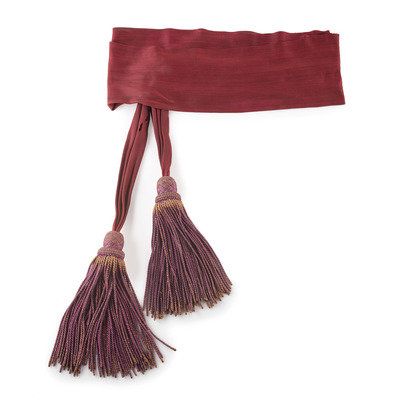Silk maroon waist sash retaining both 9 in. tassels (tassels faded and more heavily worn than sash itself).