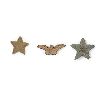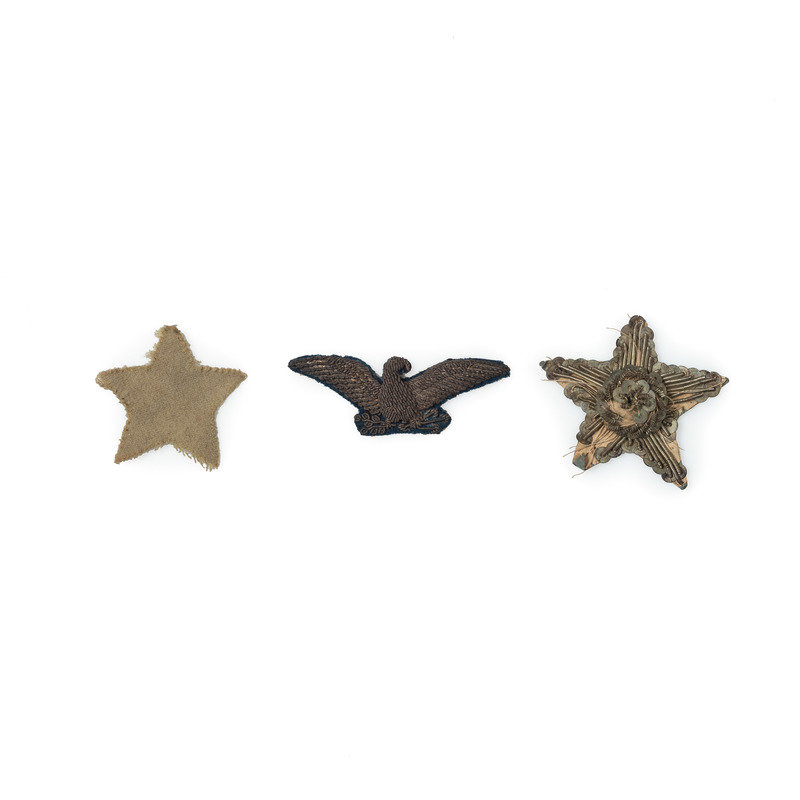 [With:] Rare, early 2 in. cloth XX Corps badge, an approx. 2 1/2 in. ornately embroidered badge-like sequin star, and a Civil War period colonel's eagle insignia.
