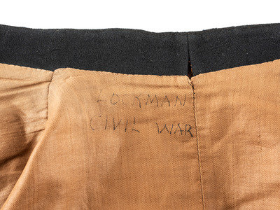 The jacket, vest, and sash were previously sold by the Horse Soldier in Gettysburg, PA, whose description indicates that the pieces were acquired at auction in New York City in 2017 from the Dr. Alan York Estate, and that the York collection included "other engraved and stenciled John T. Lockman pieces."