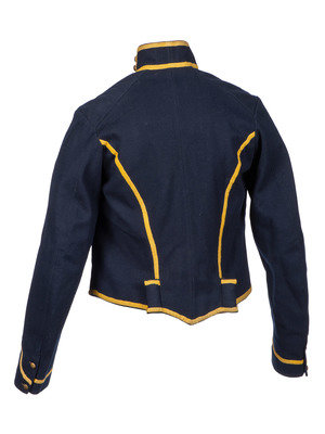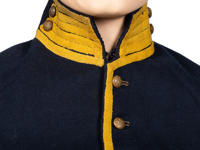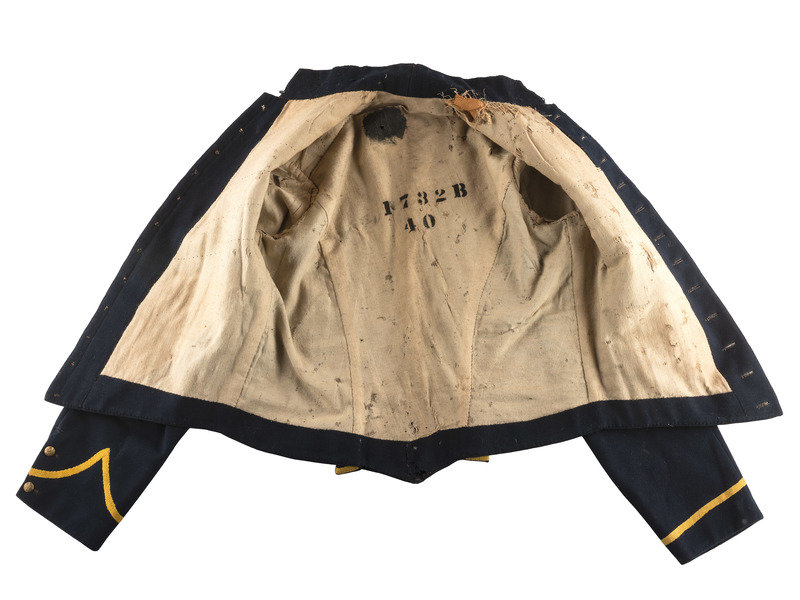 Regulation US Cavalry enlisted man's shell jacket of dark blue wool trimmed with yellow worsted wool tape. Complete with twelve button front, two buttons on each side of standing collar, two buttons at each cuff, and two pillows present at lower rear of the jacket. General service eagle buttons appear to be original with backmarks of Scovill Manufacturing and Horstmann. Tan cotton body lining and white cotton sleeve lining. Marked within the right sleeve is a stamp "3X." Left sleeve with size "3" and stamp "SA" indicating Schuykill Arsenal of Philadelphia. Black paint stenciled block letters and numbers in center of body lining "1732B / 40."