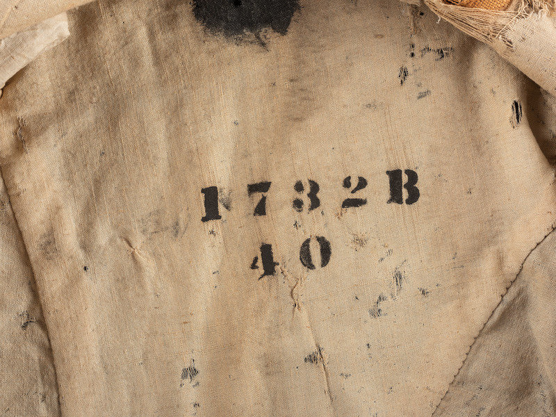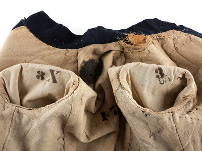Exterior blue wool in good condition with scattered mothing and light soil. Interior lining lightly soiled with some tears and wear, particularly at left shoulder and near left sleeve, and with approx. 2 1/2 in. diameter black residue on back of coat near neck, possibly black paint. Overall coat in good condition for a jacket with period use.