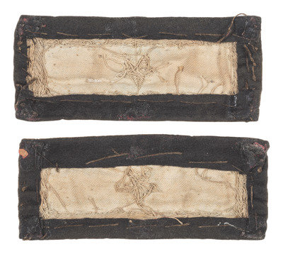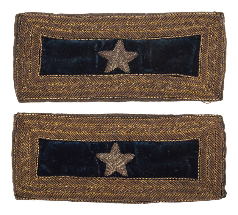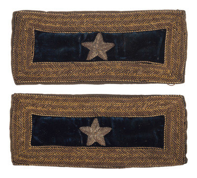 Each 1 7/8 x 4 5/8 in. brigadier general shoulder straps (minor darkening and tarnish to bullion, light wear to velvet pile). Composed of triple-bordered gold bullion embroidery and embroidered silver bullion rank device, twisted brass wire outer border, navy velvet centers, and fold-over cloth backs with open center and visible stitching. An example of exceptional quality.