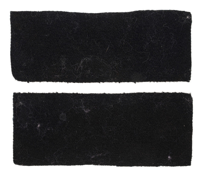 Approx. 3 1/8 x 1 1/4 in. lieutenant colonel straps (bullion unraveling and darkened in some spots, wear to velvet centers). Straps feature gold bullion borders, silver bullion rank devices, navy velvet centers, and black felt backing.