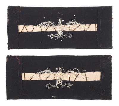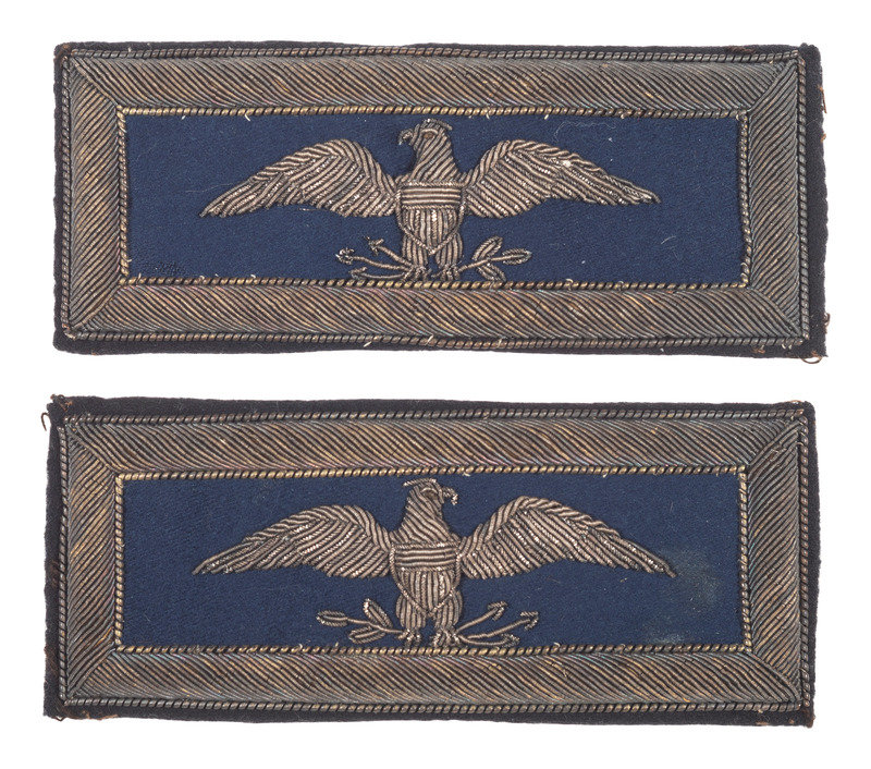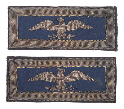 Approx. 4 1/4 x 1 3/4 in. colonel of infantry straps (some wear to borders, one strap with few spots of discoloration to center). Straps feature finely embroidered bullion borders and 2 1/2 in. eagles, with blue wool centers, and fold over cloth backs with open centers and visible stitching.