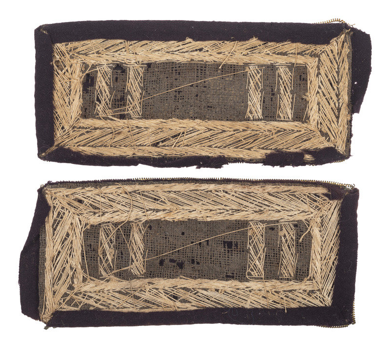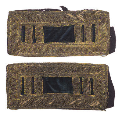 Each 2 1/8 x 4 5/8 in. captain of staff shoulder straps (some fraying, loss of bullion, darkening, some loss of pile to velvet). Shoulder straps featuring triple-borders and captain's rank bars elaborately embroidered in gold bullion. With additional twisted brass wire outer border, navy velvet centers, fold over cloth backs, open centers with visible stitching.