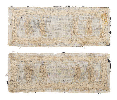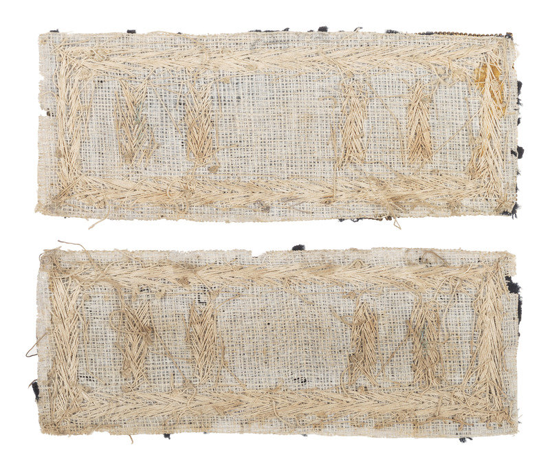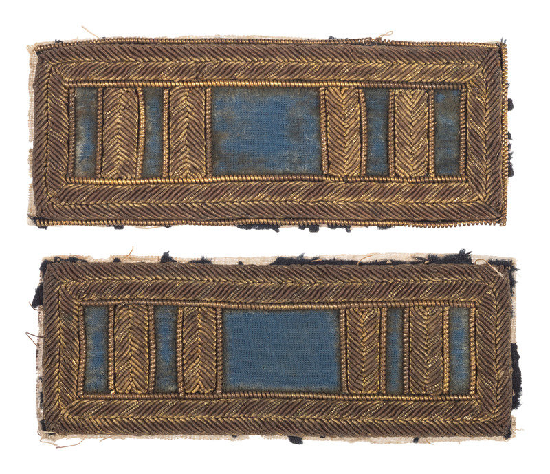 4 5/8 x 1 3/4 in. double bordered captain of infantry straps (some darkening to bullion borders, heavy wear and some discoloration to velvet centers). Straps feature gold bullion embroidered borders and rank devices, blue velvet centers, and open backs with visible stitching.
