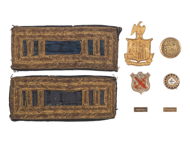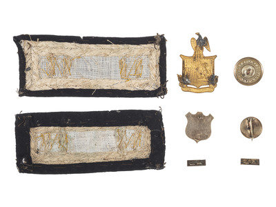 [With:] Approx. 7/8 x 1 in. silver and red enamel IX Corps badge, with T-bar to reverse (lacking pin). -- 17 mm diam. gilt brass with white and blue enamel IX Corps, with T-bar to reverse. -- 23 mm diam. brass New York State button. Waterbury, CT: Scoville Mfg. Co. Maker's mark to reverse. -- Approx. 1 3/8 x 2 in. die-struck gilt brass New York State Seal insignia, 3 pins soldered to reverse. -- 1/2 x 3/16 in. pair of brass rank bars, each with 2 pins to reverse. -- Together, 6 items, condition generally very good to fine, occasional darkening.