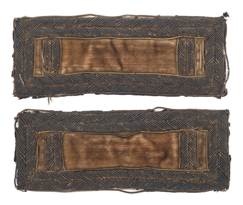 Each1 7/8 x 4 3/4 in. double bordered first lieutenant of cavalry shoulder straps (darkened, throughout, wear consistent with age and use). Straps feature gold bullion borders and rank devices, twisted brass wire outer border, yellow velvet centers, and fold-over cloth backs with open centers and visible stitching.