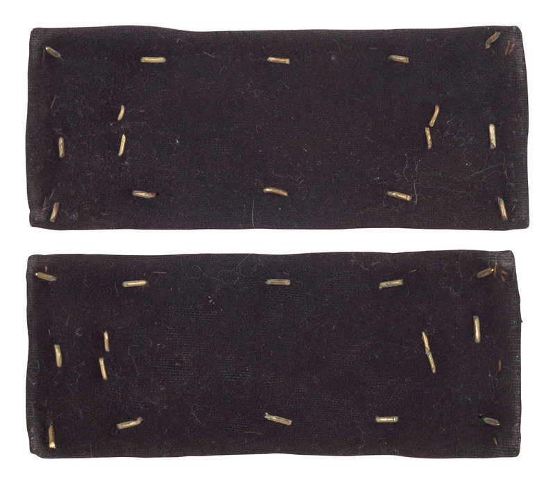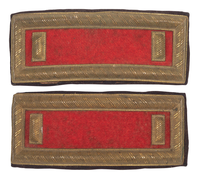 4 x 1 5/8 in. single bordered lieutenant of artillery straps (few darkened spots, good condition). Straps feature stamped brass relief borders and rank devices, bright red wool centers, and black cloth backing.