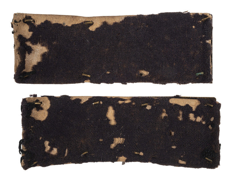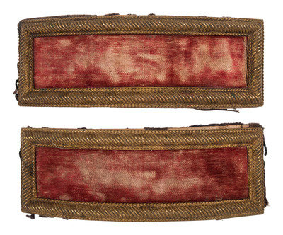 3 1/4 x 1 1/8 in. lieutenant of artillery straps (few darkened spots to brass, heavy wear to velvet centers, some loss to cloth backing). Straps feature stamped brass relief borders, red velvet centers, and black cloth backing.