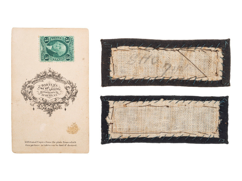 [With:] Vignetted bust portrait of a second lieutenant with dark green shoulder straps. Auburn, NY: Harter's Fine Art Gallery, n.d. 2 1/16 x 3 5/8 in. hand-colored albumen CDV on cardstock mount (soiling, a few spots). Green 3-cent revenue stamp affixed to verso. Photographer's imprint to verso.