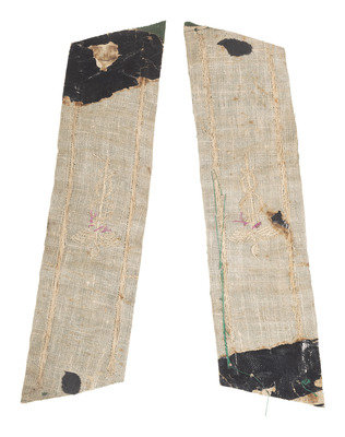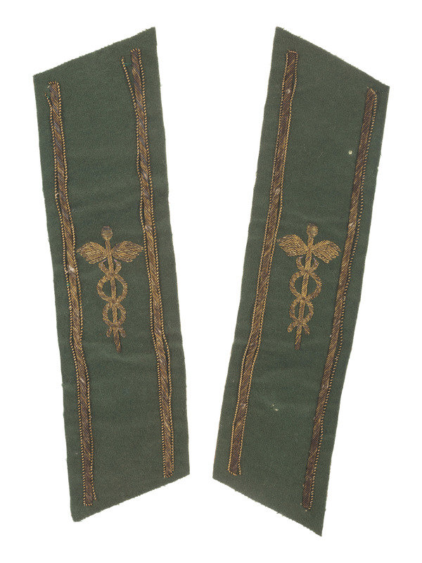 Pair of approx. 9 1/4 x 2 1/2 in. green wool chevrons (some darkening and wear to bullion including loss to one full side of dead bullion outline, few spots of wear to wool). Chevrons feature gold bullion embroidered caducei flanked by straight line borders of gold bullion thread outlined by dead bullion, and open backs with visible stitching and remnants of black paper covering.