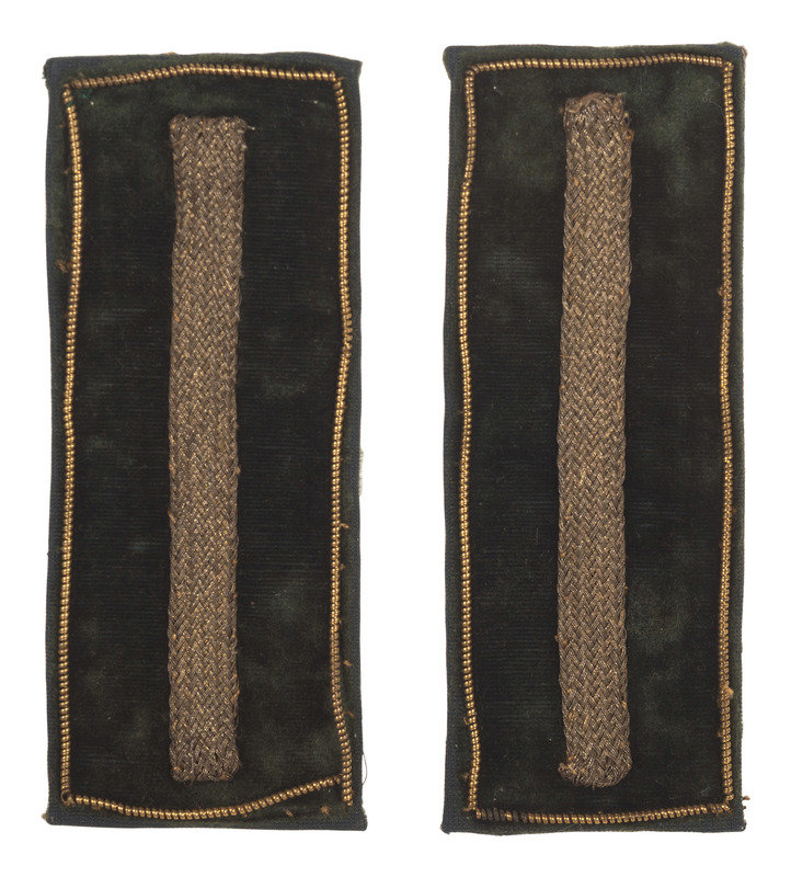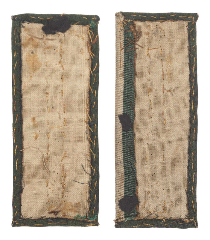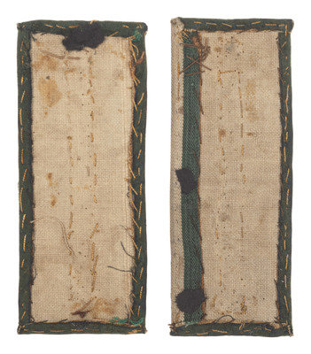 Pair of 4 x 1 1/2 in. green velvet insignia (some waviness to borders; worn spots to velvet centers). Each features a full dead bullion border, gold bullion thread bar device, green velvet center, and open back with visible stitching.