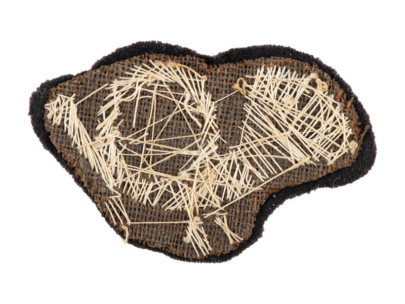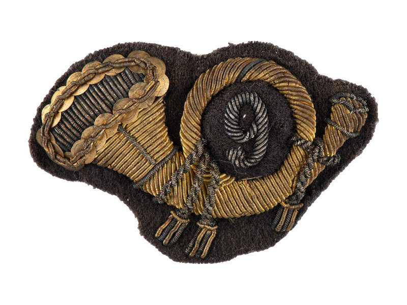2 1/8 x 1 3/8 in. infantry officer's embroidered gold bullion horn insignia with embroidered silver regimental "9" (general wear commensurate with age and use, bullion darkened in few areas). Comprised of gold and silver bullion embroidery including sequins and twisted strands upon black cloth. Stitching visible on open back. Regimental number "9" embroidered inside central horn loop.