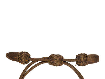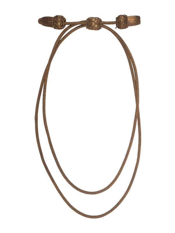 Approx. fully-extended circumference length 26 in. Double gold bullion hat cord ending in acorns with central slide. For commissioned officers' slouch hats.