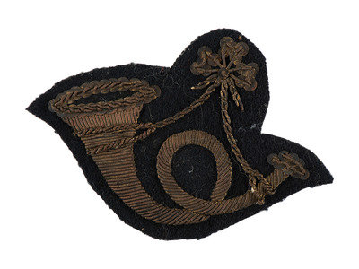 2 3/4 x 1 15/16 in. infantry uniform insignia, gold bullion and sequins embroidered on black felt (darkened). Looped horn suspended by twisted bullion from a 3-lear knot. Campbell and O'Donnel note that this insignia "adorned infantry officers' coat skirts in [the] 1830s and was occasionally worn as a militia cap insignia during [the] 1840s and 1850s. (p. 128, figure 309).