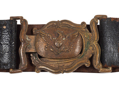 Approx. 33 x 1 3/4 in. blackened leather belt with 2-piece gilt cast brass tongue and wreath buckle and brass adjuster buckle (leather with crazing to blackened surface, darkening to tongue and wreath pieces, approx. 1 1/2 in. tear in leather resulting in near complete separation). O'Donnell and Duncan Campbell describe this elaborate Victorian design as being worn extensively by independent companies, bands and firemen during the 1840s and 50s, primarily New England troops (Plate 329, p. 216).