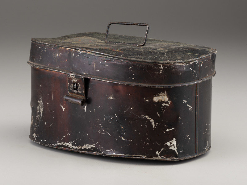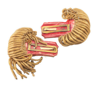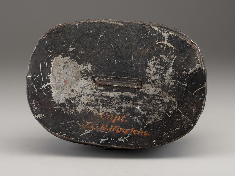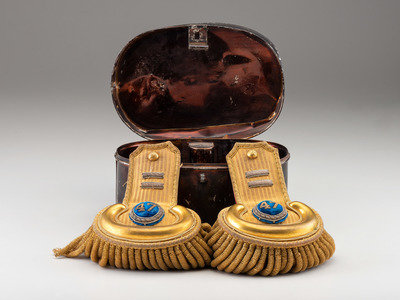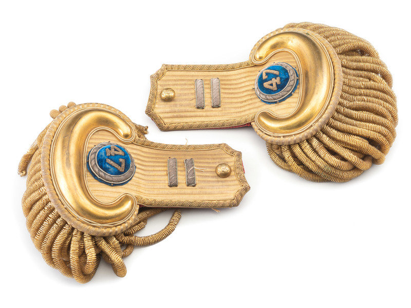 Cased set of captain's epaulettes housed in tin case with "Capt. J.C.E. Hinrichs" painted onto black finish below the handle. Each epaulette with gilt bullion tape body, triple row of heavy bullion fringe, and gilt brass crescents. Undersides with red silk and red Moroccan leather. Brass fasteners marked "Left" and "Right" respectively. Pair of high relief captain's bars indicating rank along with regimental number "47" on circular blue field. Eagle buttons at edge function as unlocking pins to hold epaulettes in place. Overall wear, especially to underneath red silk and leather, loose embroidery threads, and some pulls on fringe, but overall in good condition. Black tin case retains wire handle, though lock mechanism no longer functioning. Case with wear, scattered scratches to finish, and indentations.