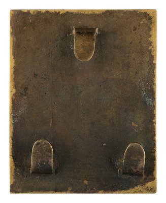 2 1/2 x 3 1/8 in. gilt cast brass plate with integral rounded end hooks on verso (some wear, darker patination in spots). Plate features die-struck silver plated letters and wreath soldered onto face. This exact variant is not featured in O'Donnell and Campbell.