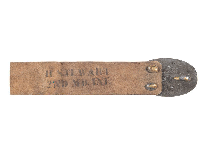 Approx. 8 1/4 x 1 7/8 in. buff leather belt fragment with die-struck brass "US" belt plate having round studs and maker stamp "W.M. Mayer, 1861" on verso (buff leather with soiling and discoloration throughout; plate with heavy discoloration, a few dings, and letters carved into verso). Belt features stenciled identification on interior: "H. Stewart / 2nd MD. Inf."
