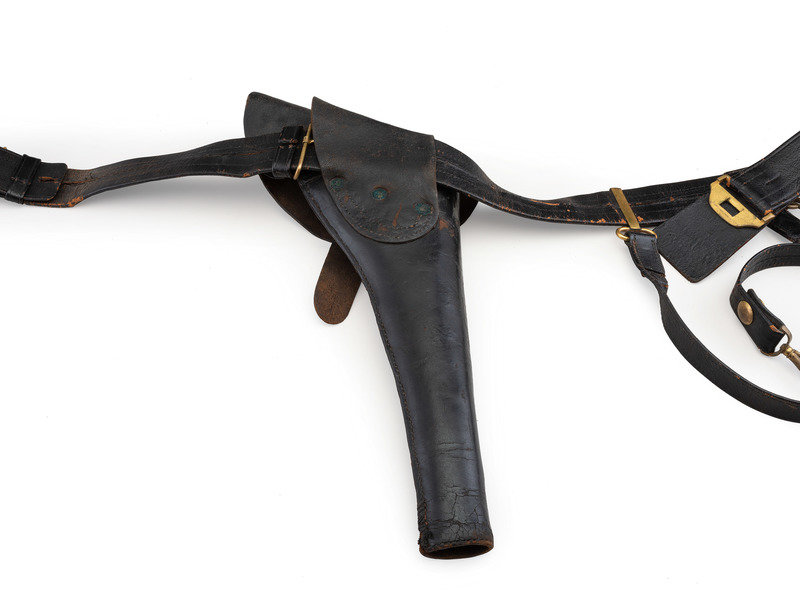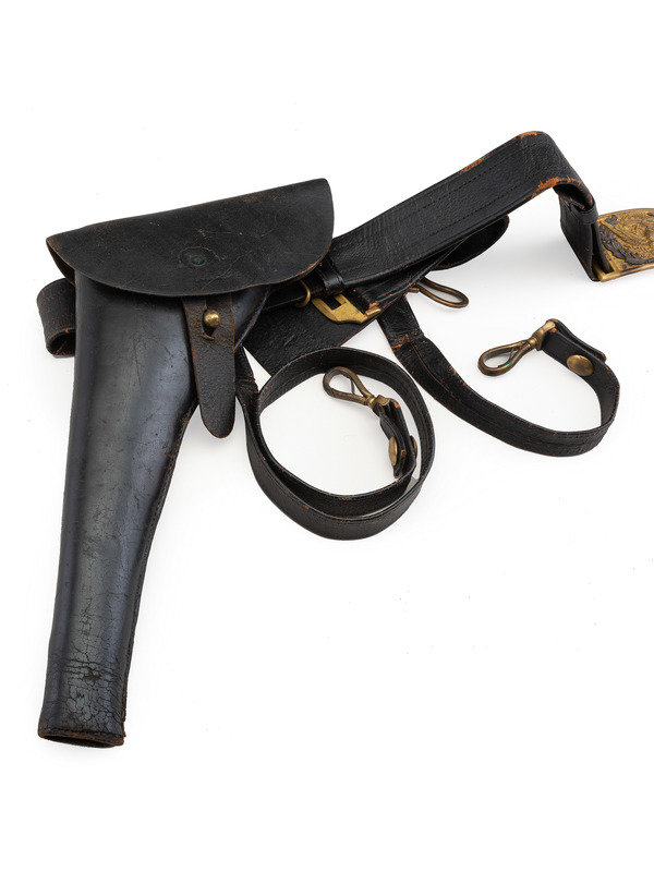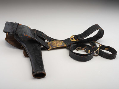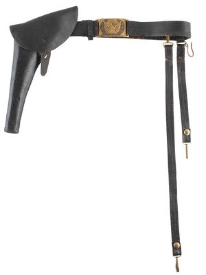 Approx. 35 in. folded and sewn leather belt with brass keeper and 3 1/4 x 2 in. cast brass eagle plate with narrow tongue and 3-piece silver wreath (belt with one loop fully separated, general wear to leather surface throughout; plate with some spotting; no bench numbers present). Belt includes both hanging straps with brass sword snap hooks, leather uniform protector, brass scabbard support hook, and leather holster likely made to fit a Colt 1860 Army or Remington New Model Army.