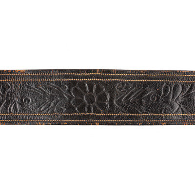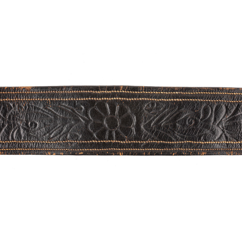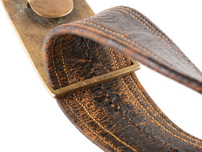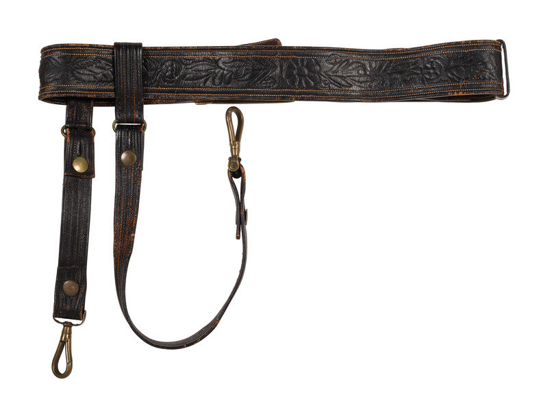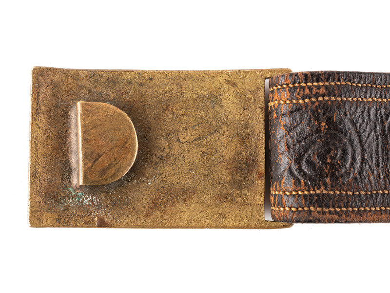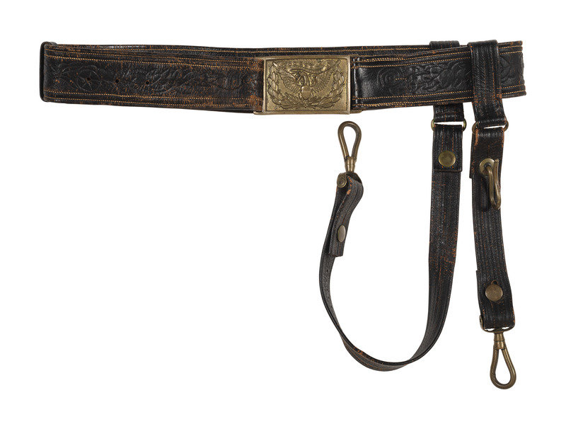 Approx. 30 in. folded and sewn leather belt with brass keeper and 3 1/4 x 1 7/8 in. cast brass eagle plate with 1 in. wide tongue (leather very pliable, with surface wear throughout, and some separation to a section of stitching on belt interior; plate with light oxidation spotting; bench number represented as roman numeral "XXIII" cut into plate edge). Belt features fine swirl stitching, and includes both hanging straps with brass sword snap hooks, leather uniform protector, and brass scabbard support hook, but lacks D-ring for over-the-shoulder support strap.