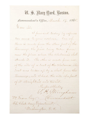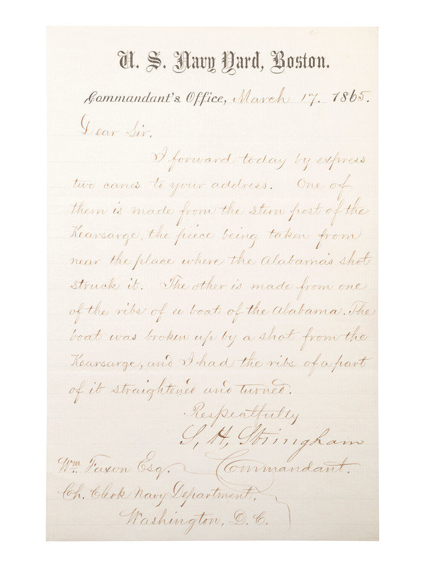 [With:] STRINGHAM, L. H. Autograph letter signed ("L.H. Stringham"), to William Faxon, Chief Clerk Navy Department. U.S. Navy Yard, Boston, 17 March 1865. 1 page, 8vo, on U.S. Navy Yard letterhead. The commandant writes to Faxon informing him that two canes are on the way. “One of them is made from the stern post of the Kearsarge, the piece being taken from near the place where the Alabama’s shot struck it. The other is made from one of the ribs of the boat of the Alabama. The boat was broken up by a shot from the Kearsarge, and I had the ribs of a part of it straightened and turned.” The war didn’t end until Lee surrendered on 9 May 1865, by which time the souvenir mentality had already established itself.