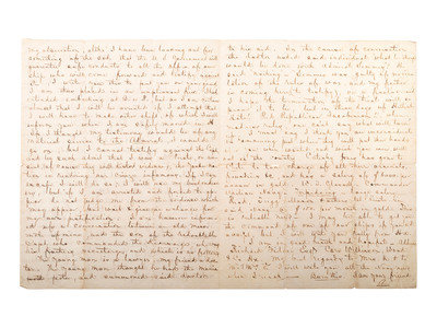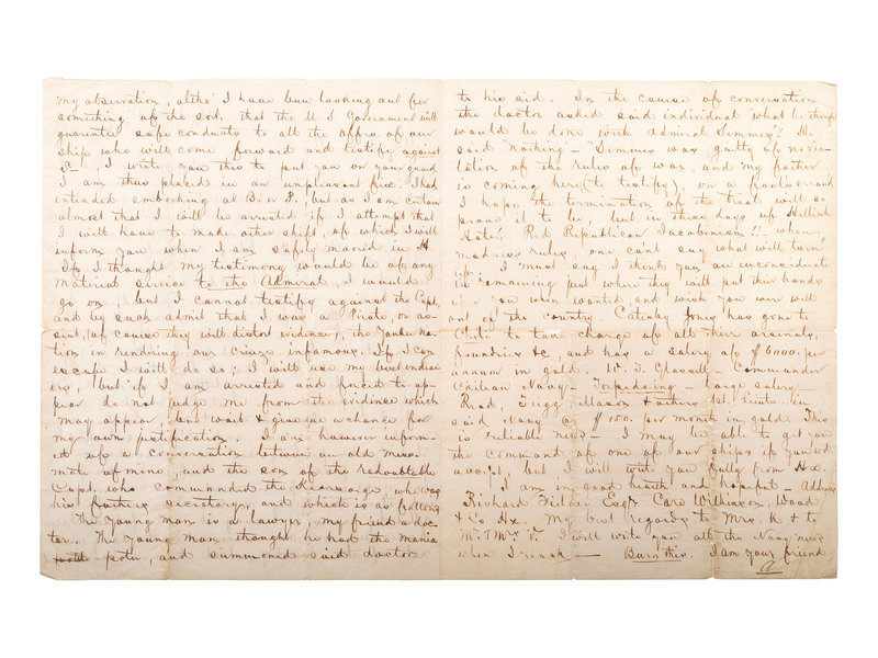 The addressee is John McIntosh Kell, Executive officer to the ship’s commander, Raphael Semmes. The writer uses initials for himself and his correspondent, as well as for destinations, because, as an officer on board the Alabama, he is subject to arrest for treason, as the Alabama was a commercial raider. The letter was written during the period between 15 December 1865, when Semmes was arrested for treason, and 7 April 1866, when he was released and the charges dropped. “A” plans to leave the country to evade arrest. He notes press reports to the effect that “the U. S. Government will guarantee safe conducts to all the offrs. of our ship who will come forward and testify against S[emmes]. I write you this to put you on your guard, and I am thus placed in an unpleasant fix. I had intended embarking at B. or D., but as I am certain almost that I will be arrested, I will have to make other ships...” He says he would testify for Semmes if he thought it would do any good, but I cannot testify against the Capt. and by such admit that I was a pirate.” In any event, he doesn’t think that Semmes will be punished: “I am however informed of a communication between an old messmate of mine, and the son of the redoubtable Capt. who commanded the Kearsarge, who was his father’s secretary, and which is as follows...In the course of conversation, the doctor asked said individual ‘what he thought would be done with Admiral Semmes.’ He said ‘Nothing’—’Semmes was guilty of no violation of the rules of war, so my father is coming here (to testify), on a fool’s errand.’” The charges against Semmes were dropped and he was released. "A” goes on to name fellow officers who have secured lucrative positions with the Chilean Navy—Catesby Jones and W. L. Glassett—and offers to intercede on Kell’s behalf if he’s interested. An intriguing letter written in the aftermath of the famous battle fought off Cherbourg, France, on 19 June 1864.