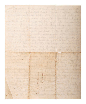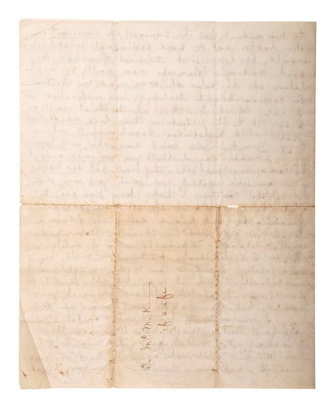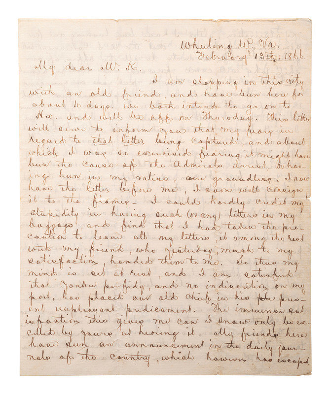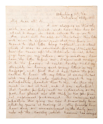 Autograph letter signed ("A") to Mr. [John McIntosh Kell]. Wheeling, WV, 13 February 1866. The integral address leaf partially identifies the recipient as John M. K. 4 pages, 4to, toning and small losses on old folds.