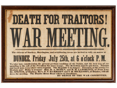 [CIVIL WAR]. Death for Traitors! War Meeting! Broadside. [Yates County, NY]: ca 1861-2.