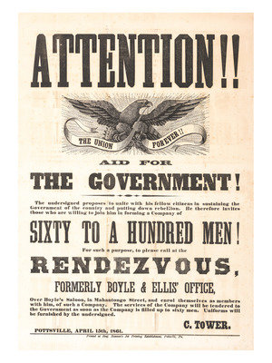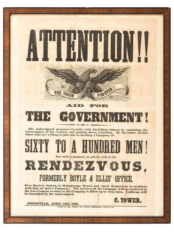 14 x 20 1/4 in. (sight) recruitment broadside for the 6th Pennsylvania Infantry, framed to 17 1/8 x 22 1/8 in. (creasing at folds, light soil, minor losses at edges and folds, unexamined outside frame). Undersigned in type by C. Tower. Top center features large, bold type "ATTENTION!!" below which appears an illustration of a spread-winged eagle with a riband in its beak bearing the text "The Union / Forever!!" Below the eagle text reads: "AID FOR THE GOVERNMENT! / The undersigned proposes to unite with his fellow citizens in sustaining the / Government of the country and putting down rebellion. He therefore invites / those who are willing to join him in forming a Company of / SIXTY TO A HUNDRED MEN!"