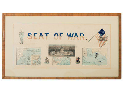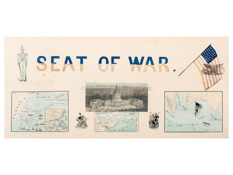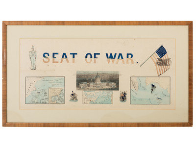 27 1/2 x 12 1/2 in. (visible) lithograph, matted and framed, 33 1/2 x 18 3/4 in. (fold lines, with a few areas of separation at folds, occasional spotting, unexamined out of frame). Features panoramic view of Washington, DC, at center, with the US Capitol building in the foreground and museums, offices, monuments, and neighborhoods labeled in the background. With 3 inset maps of Pensacola Bay, Washington, DC and surrounding states, and Charleston Harbor, with various locations marked, among them Fort Pickens and Fort Sumter. Patriotic and military motifs similar to those used in Magnus' illustrated covers and letterhead are also included.