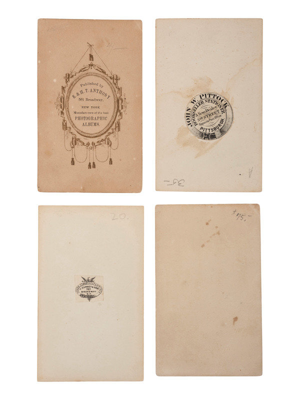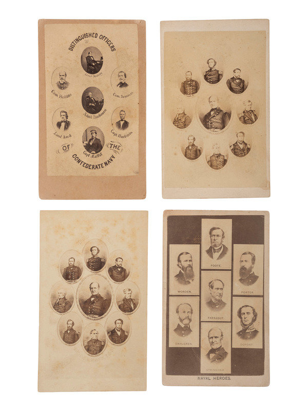 [With:] Distinguished Officers of the Confederate Navy. New York, NY: E. & H.T. Anthony. CDV, period commercial copy image with seven oval portraits including "Lieut. Maury, Com. Hollins, Com. Semmes, Adm'l Buchanan, Lieut. Reed, Capt. Hartstein, and Capt. Maffit." -- Naval Heroes (of the US). CDV comprised of seven miniature oblong CDVs including "Foote, Worden, Porter, Farragut, Dahlgren, Dupont, and Stringham." Uncredited. -- Duplicate composite CDVs, one by John W. Pittcock, Pittsburg, PA, the other, with applied paper label of J. Gurney & Sons, New York, which has a larger oval portrait of "Com S.H. Stringham" surrounded by smaller oval portraits of "Com. S.F. Dupont, Lieut. Dan' L. Braine, Capt. W.H. Ward, Com. Hiram Paulding, Capt. C. Ringold, Com. T.A.M. Craven, Capt. A.M. Foote, and Com. Sam'l L. Breese." These two CDVs are identical except that the small captioned names in the carte by Pittock are nearly washed out, the result of generational loss.