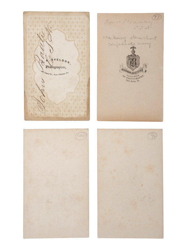 [With:] CDV, lithographic portrait identified as "Com. Maury / Confederate Navy." Baltimore, MD: Bendann Bros. Commodore Matthew Maury (1806-1873) was an esteemed intellectual in multiple nautical subjects and served the Confederacy as naval envoy in Great Britain and France during the war. -- Civilian view boldly inscribed in ink on verso as "John Battle / CSA." New Orleans, LA: J.A. Sheldon (mottled with soft clarity and rounded corners, good condition overall). Confederate "John Battle" is unknown, one of 18 so-named Confederate soldiers in HDS.