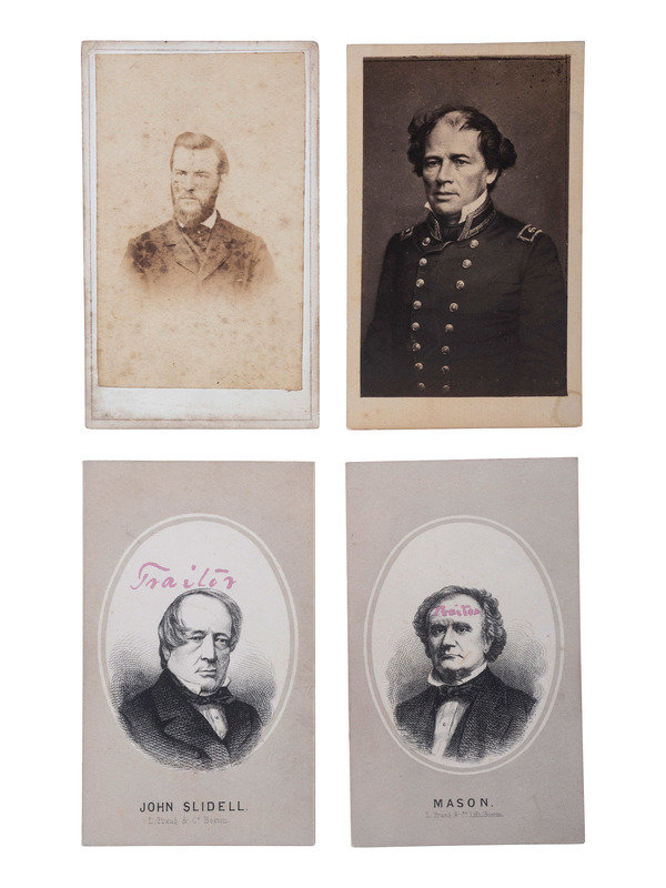 CDV, lithographic portrait of John Slidell. Boston, MA: L. Prang & Co. "Traitor" inked above Slidell's head. -- CDV, lithographic portrait of James Mason. Boston, MA: L. Prang & Co. "Traitor" inked on Mason's forehead. The 8 November 1861 seizure by the US Navy of Confederate envoys Mason and Slidell aboard the British steamer RMS Trent ignited a diplomatic crisis that nearly precipitated war with Great Britain. The Lincoln administration later relented and released the two envoys with a public disavowal but not an apology.