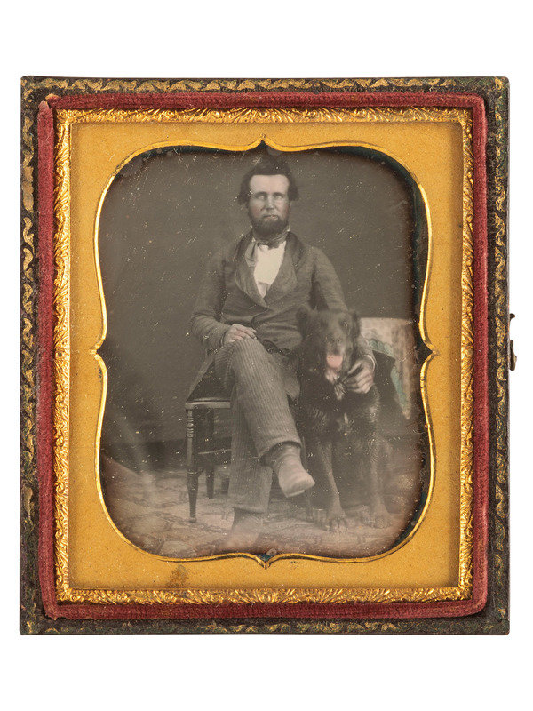 Sixth plate daguerreotype portrait of a man with his dog "old Jack." (Tarnish at perimeter.) Housed in a full pressed paper case (residue to velvet, wear to extremities). Inked paper label affixed to velvet pad reads: "B.H. Streeter - taken in Clyde. N.Y. with old Jack." A ban sits with crossed legs and his arm around a dog.