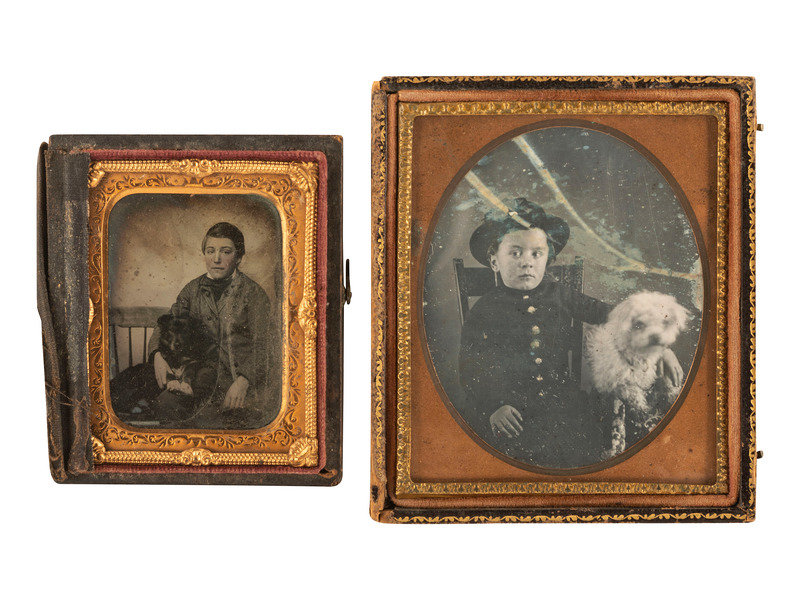 [With:] Sixth plate daguerreotype portrait of young boy and a small white dog. (Stain across plate, some wiping/surface scratches.) Housed in half pressed paper case (heavy scuffing).
