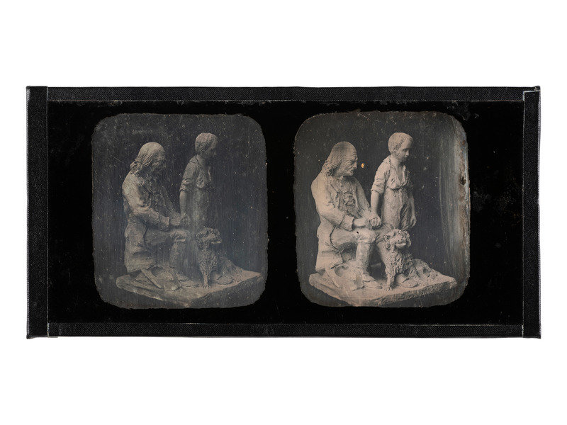 [EARLY PHOTOGRAPHY]. DUBOSCQ-SOLEIL, (Louis) Jules (1817-1886), photographer. Stereodaguerreotype of sculpture depicting man posed with young boy and dog.