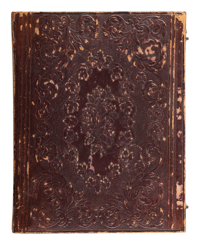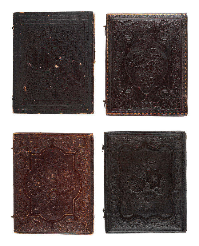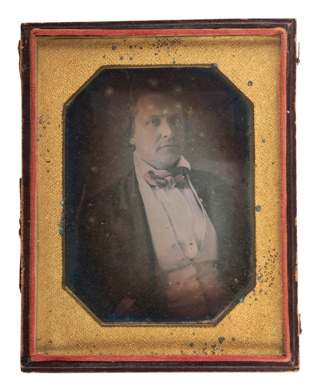 Half plate half portrait of a young man wearing a hand-tinted bowtie. (Heavy tarnish and spotting to plate, spotting to mat, no preserver present; unsealed.) Housed in a fully separated leatherette case (significant wear and discoloration throughout). -- Quarter plate portrait of a debonair gentleman, posed with a hand-tinted curtain behind him and a book in his hand. (Tarnishing to edges, spotting to mat, no preserver present; retains original seal.) Housed in a fully separated leatherette case (wear throughout). Paper label accompanying image reads, "One of the Calvins." -- Quarter plate bust portrait of a distinguished young gentleman with neatly fixed facial hair and lightly hand-tinted cheeks. (Tarnish to edges, scattered dust to plate, spotting to mat; retains original seal.) Housed in a fully separated leatherette case (significant wear including corner separation). Paper label accompanying image reads, "Edward [T?] Bellah." -- And 12 other daguerreotypes, including 4 quarter plate examples and 8 sixth plate examples. -- Together, 15 portraits of men.