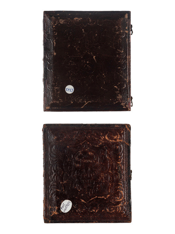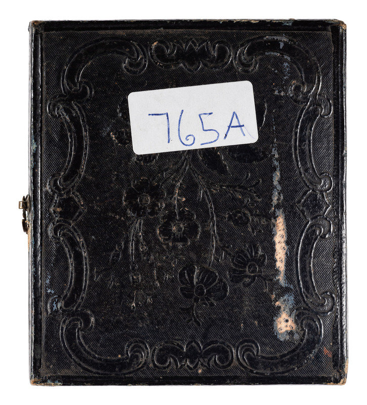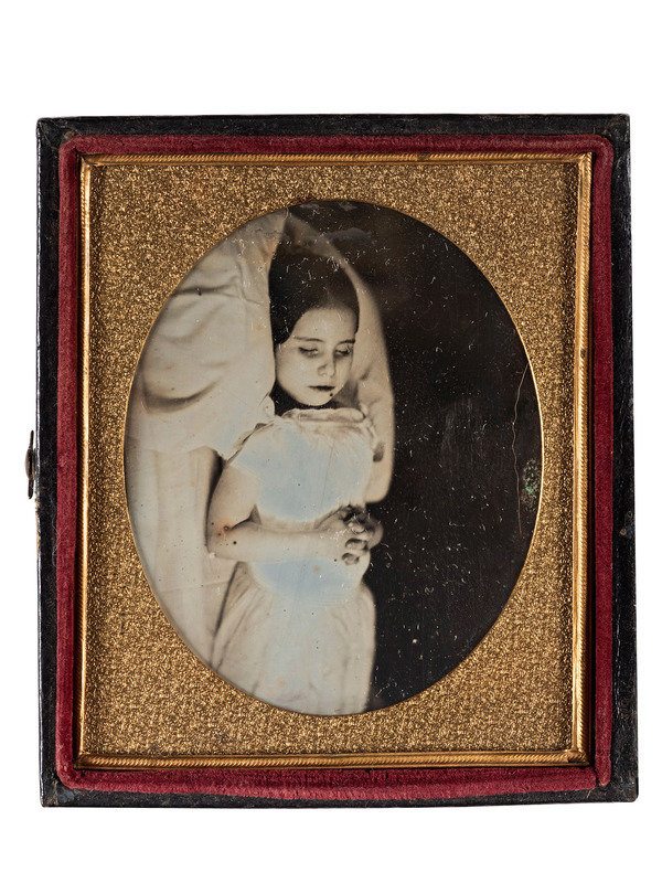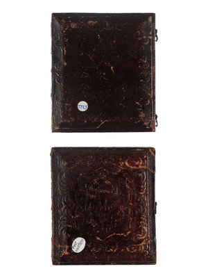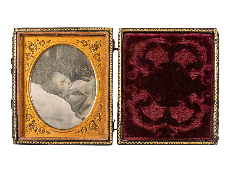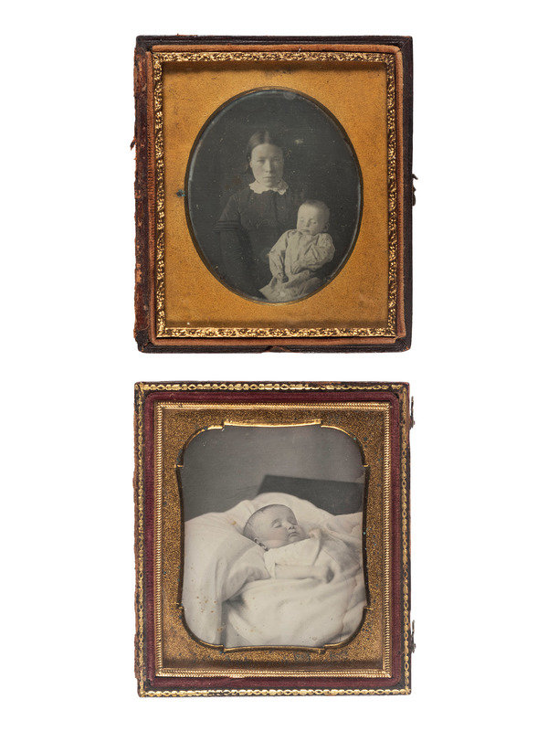 2 sixth plate daguerreotypes of infants laid to rest. (Each with few spots, some wipes and few scratches to one of the plates.) One housed in full pressed paper case (separated at hinge, surface scuffing and edge wear), one housed in half case. -- Sixth plate daguerreotype of mother with child after death. (Few spots to plate.) Housed in half case. -- Sixth plate daguerreotype of young girl laid to rest. (Some scattered spots to plate.) Housed in full case (surface wear). With tag from Samuel T. Freeman & Co. auction company.