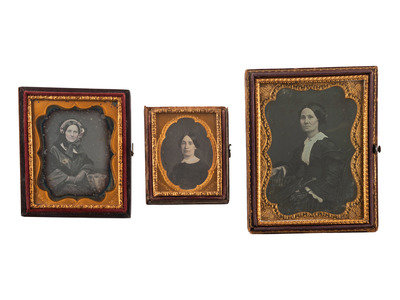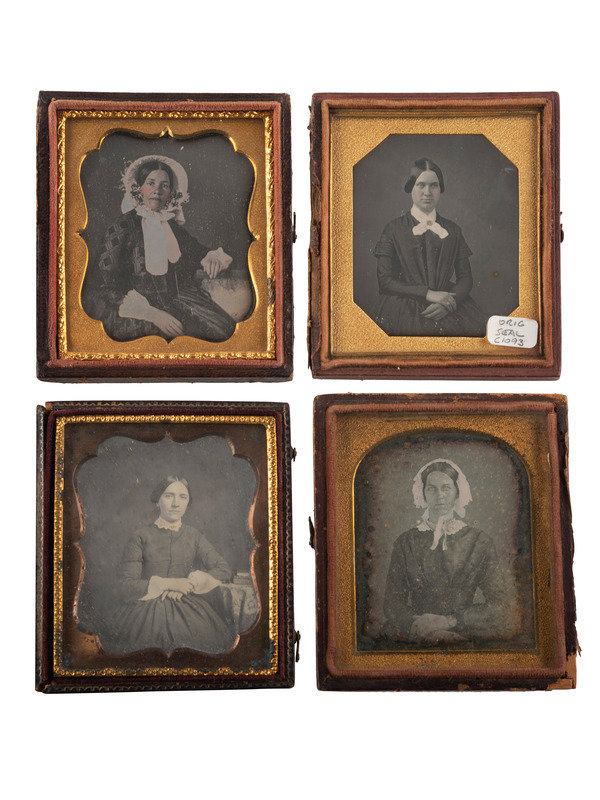 A quarter plate portrait of a well-dressed woman wearing a brooch, necklace, black ruffled dress, and lace gloves. N.p.: n.p., n.d. (Some scratching and spotting to plate; cleaned and resealed 1992.) Housed in a half pressed paper case (heavy wear including some loss). -- A sixth plate portrait of a lovely middle-aged woman, identified as "Aunt Rebecca Bl[omer?] on accompanying paper scrap, wearing a floral bonnet and gloves, with a book resting on the table next to her. New York: Anson, n.d. (Tarnishing to edges, spotting throughout; unsealed.) Housed in a full pressed paper case (general wear). Photographer's stamp to mat. -- A ninth plate half portrait of a woman wearing a lace collar and brooch. Morristown, PA: W.M. Stroud, n.d. (Some clouding to image, with light tarnish to left edge; unsealed.) Housed in a fully separated pressed paper case (upper edge of case bottom missing, general wear). Photographer's stamp to mat. -- And 16 others, including one quarter plate example, 13 sixth plate examples, one ninth plate example, and one sixteenth plate example.