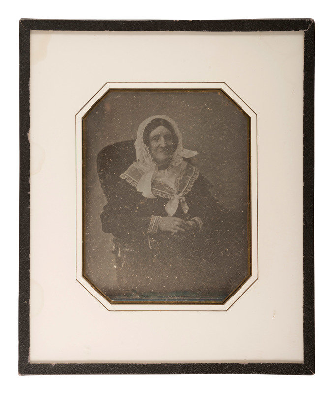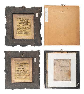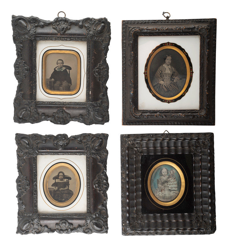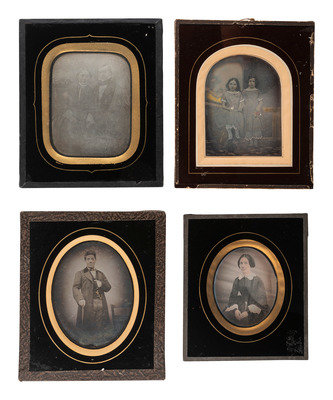 2 3/4 x 3 5/8 in. (sight) ambrotype portrait of a lovely young woman wearing a boldly striped dress and holding a book in one hand, its pages highlighted gold. (Minor image fading in spots, otherwise excellent clarity; unexamined out of the frame.) Housed under what appears to be an eglomise mat with decorative jewel adornments, inside of a wall frame with hanging fob at top (surface wear and cracking to frame). -- 2 3/4 x 3 5/8 in. (sight) ambrotype portrait of a dashing young gentleman wearing a grin and a patterned vest with gold-highlighted accessories. (Tarnishing around edges, light spotting throughout; unexamined out of the mat.) Housed under an eglomise mat with sealed edges (some loss to black finish of mat). -- 2 1/4 x 2 7/8 in. (sight) daguerreotype portrait of a young girl holding her doll, the background and the girl's eyes tinted light blue. (Spots of tinting loss and image deterioration to plate, doll a bit blurry from likely movement; unexamined out of the frame.) Housed under an eglomise mat inside of a wall frame with hanging fob at top (back of frame with new seal). Remnants of pencil and ink inscriptions written in French visible through clear adhesive on back of frame identify the subject as "Noemie Touchon," born in 1848, and the photograph as having been taken in 1854. -- 2 3/4 x 3 5/8 in. (sight)daguerreotype portrait of two young girls wearing matching dresses featuring hand tinting. (Some softening of focus and image deterioration to certain spots, with tarnishing and spotting to edges; unexamined out of the mat.) Housed under an eglomise mat with sealed edges. (wear to adhesive at edges). One of the girls holds a basket of flowers tinted in red. -- And 5 other portraits including 3 matted and sealed daguerreotypes and 2 framed ambrotypes by W.H. Ainsworth. -- Together, 9 attractive European portraits housed in decorative mats and wall frames.