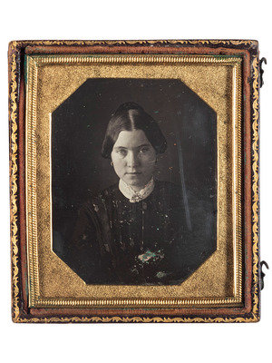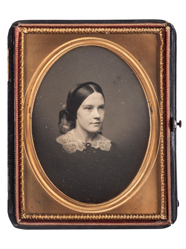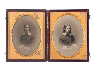 Quarter plate daguerreotype featuring vignetted portrait of young woman. (Few spots to plate, otherwise very fine condition; resealed.) Housed in Boston-style, push-button case, often used by Southworth & Hawes (loss to clasp, edge and corner wear). -- Sixth plate daguerreotype portrait of a young woman looking directly at the camera, accompanied by paper note identifying the subject as "Edith Brewster." (Few spots, tarnish to plate; cleaned and resealed 2001.) Housed in full pressed paper case (edge and corner wear). -- LEE, photographer. 2 quarter plate ambrotypes of young women, possibly sisters. Liverpool, [England]. (One image very clear, the other with some scattered spotting, no preservers present; resealed.) Housed together in full case with photographers' name in gilt on back cover (wear and some loss to surface). -- Together, 4 cased images featuring women.
