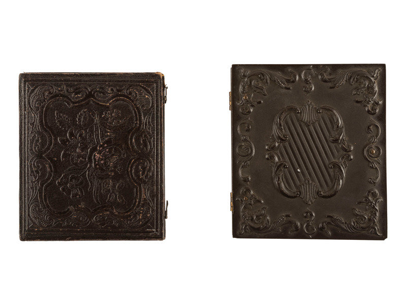A daguerreotype featuring a man covered up to his neck with fabric, his head resting on a pillow. (Heavy wiping and scratching to plate, with some spotting to image and mat; unsealed.) Housed in a full pressed paper case (general wear). -- An ambrotype of a woman resting against an unknown surface, with her lips parted and a book placed in one hand. (Heavy wear with loss to image and some loss of clarity to subject's face.) Housed in a Union case with scroll design (some surface soiling and chipping). -- Together, 2 sixth plate images.