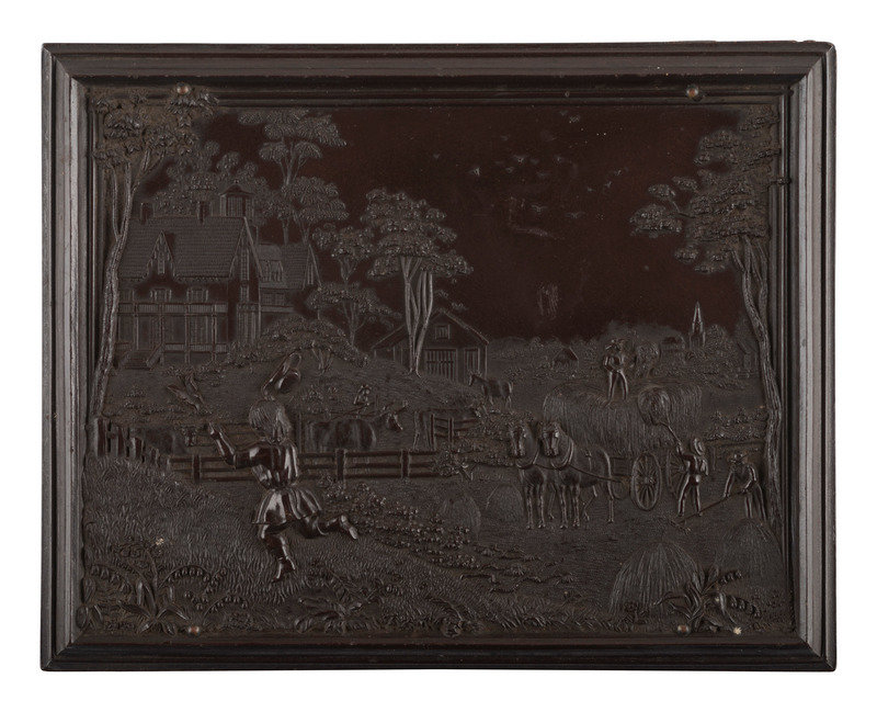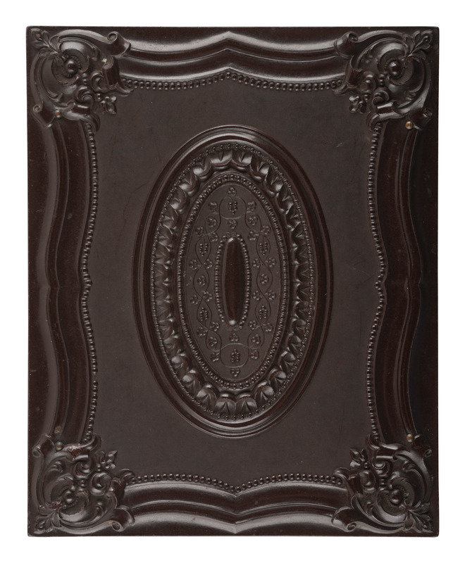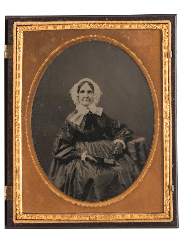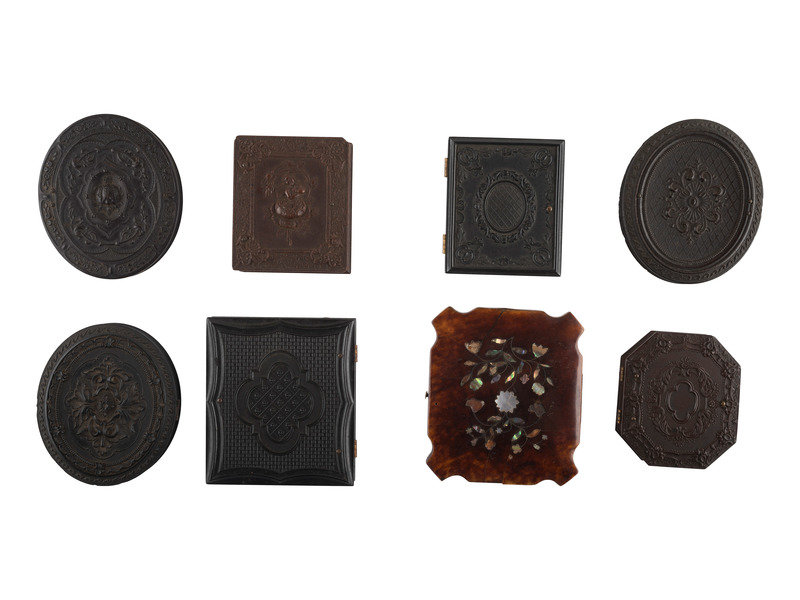 Rare half plate case with figural design, American Country Life 1 [Berg 1-11] (some surface wear and soiling). Containing an exceptionally clear ambrotype portrait of an older woman wearing a bonnet and gloves, and holding a book in one hand. -- A sixth plate case with geometric design [Berg 3-149] -- 3 Rare and Scarce sixth plate oval cases with geometric designs [3-406 (2); 3-408] -- A Scarce ninth plate octagonal case with geometric design [3-390] -- A ninth plate case with floral design, not found in Berg -- A Common ninth plate case with geometric design [3-269] -- Together, 7 Union cases.
