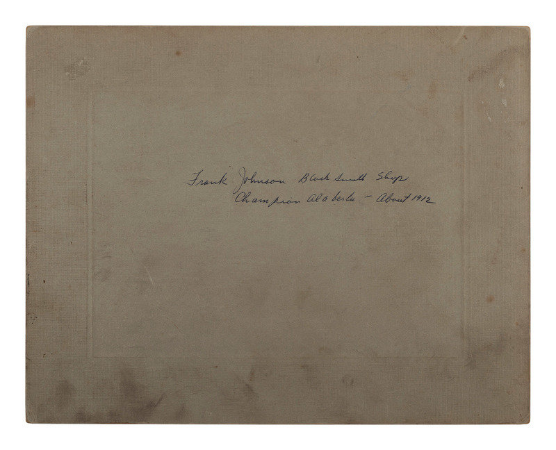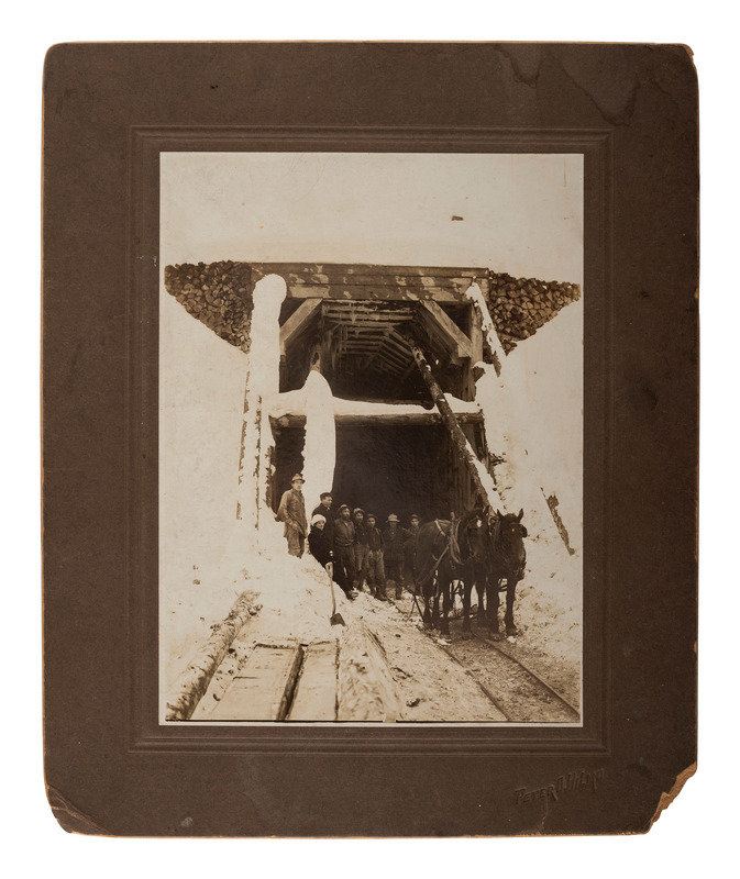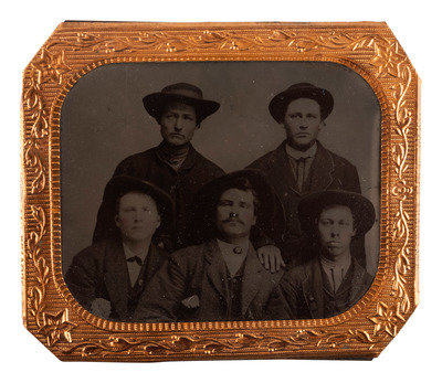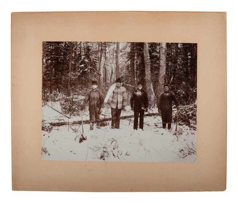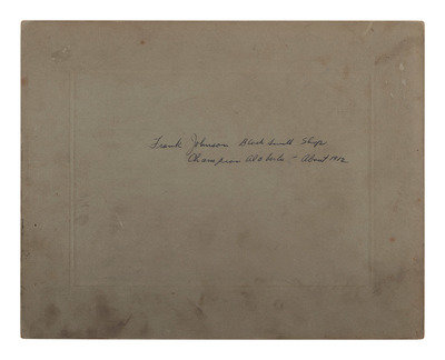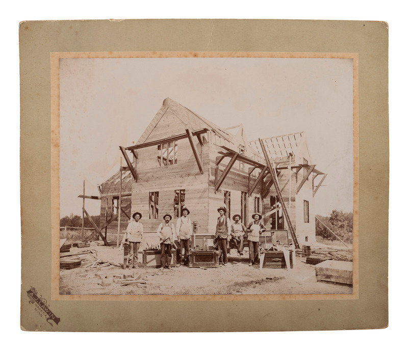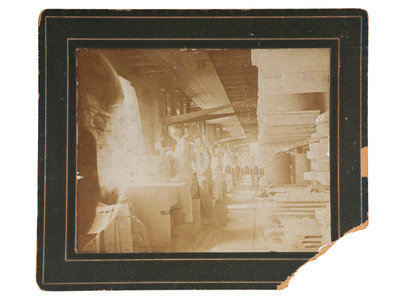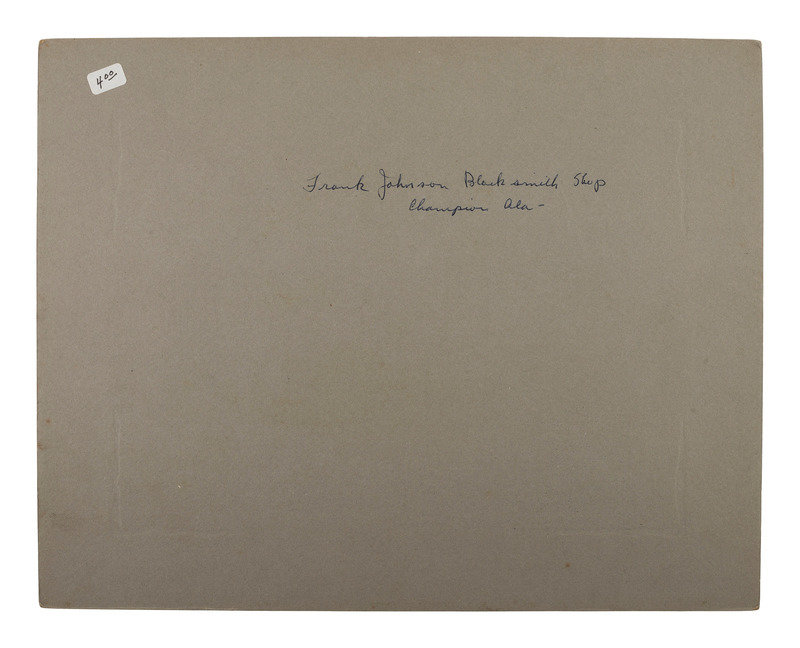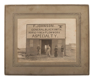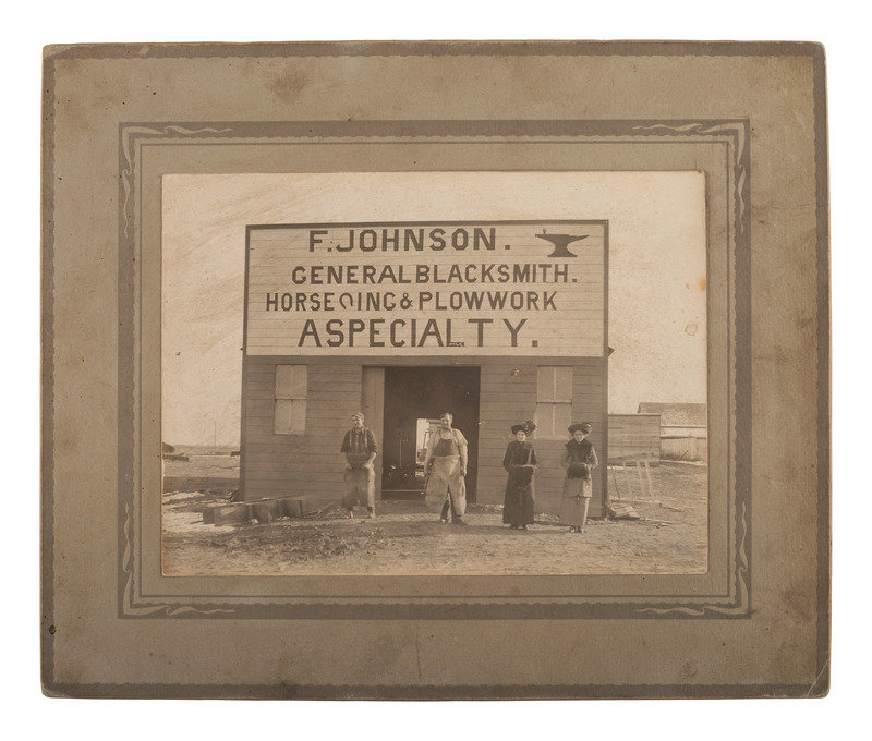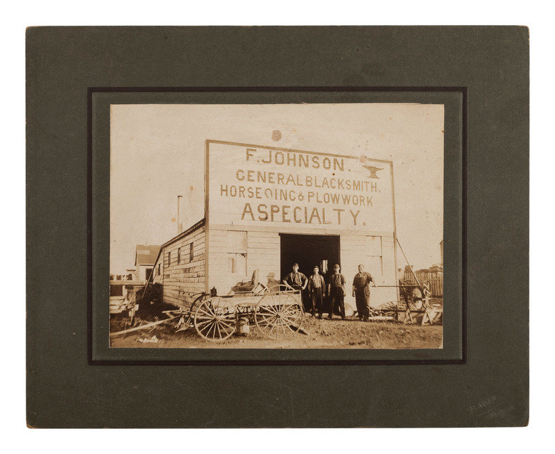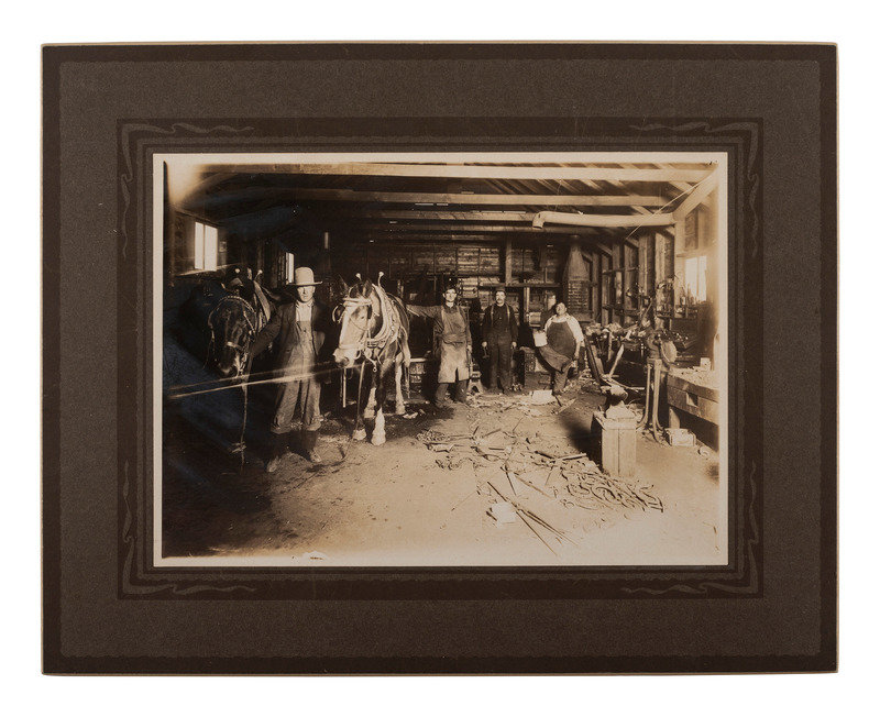 Sixth plate tintype portrait of 5 serious looking men wearing wide-brimmed hats; matted, but no cover glass or case (image a bit dark). -- 9 1/2 x 7 1/2 in. photograph on cardstock mount of a group of builders posed before a home under construction, with their tool chests. Waseca, MN: A.J. Lawin (spotting to mount recto and verso, corner and edge wear) -- 3 photographs showing employees and customers posed before and inside the business, "F. Johnson, General Blacksmith, Horseshoeing & Plowwork," 8 x 6 in., or smaller, on cardstock mounts (light surface soiling; edge and corner wear to mounts). Two of the scenes include manuscript identifications to verso, "Frank Johnson Blacksmith Shop, Champion, Alberta," one dated ca 1912. -- 8 1/2 x 6 1/2 in. photograph on cardstock mount showing a group of loggers with saws and other tools. Grand Rapids, MN: The Zenith View & Portrait Co. (light edge and corner wear to mount). -- 6 1/4 x 8 1/4 in. photograph on cardstock mount of group of men with woman near a mineshaft, two horses near foreground (light surface soiling; corner loss to mount). -- 4 7/8 x 4 in. photograph on cardstock mount providing interior view of men at work on a factory line (fading to print; loss to lower right corner of print and mount).