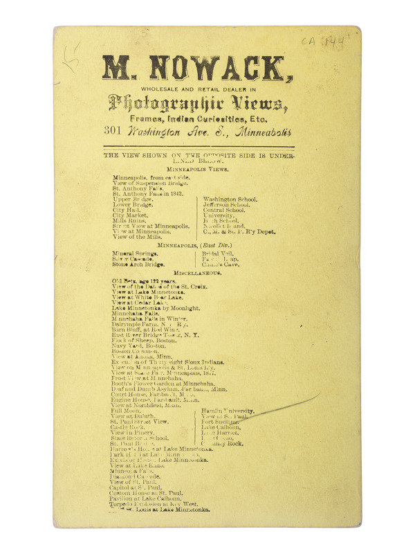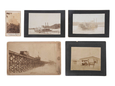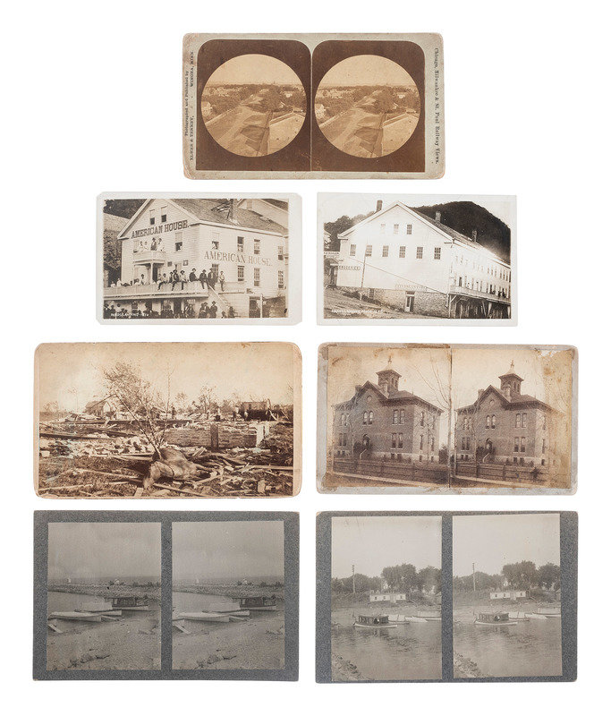 Cyclone at Rochester, Minn., Aug. 21, 1883. Winona, MN: Charles Tenney, 1883. 6 3/4 x 4 in. photograph on cardstock mount. -- View of Fort Snelling. Minneapolis, MN: M. Nowack. 6 5/8 x 4 in. photograph on cardstock mount. -- 2 stereoviews of harbors at Lake Pepin and Lake City, MN, 1 August 1906. Uncredited. 6 3/4 x 3 3/4 in. stereoviews on cardstock mounts. -- Institute for the Blind, Janesville, Wis. Janesville, WI: Porter. 2 x 3 1/8 in. CDV on cardstock mount. -- 2 early 20th century photographs, each 5 x 3 1/8 in. on cardstock mounts, of steamboats, including the Ravenna. Uncredited. -- Boudoir photograph capturing a crew posed on a locomotive. Hastings, MN: Boice. 7 3/8 x 4 1/2 in. boudoir photograph on cardstock mount. -- Bird's-eye view of a Minnesota town. Winona, MN: Elmer & Tenney. 6 x 3 1/2 in. stereoview on cardstock mount. -- Outdoor stereoview of a building with printed caption on verso describing "History, as given by Dana." Lake City, MN: Maiden Rock Copying House. 6 1/2 x 3 5/8 in. stereoview on cardstock mount. -- Early 20th century photograph of family in horse-drawn cart stopped outside a residence. 4 3/4 x 3 1/2 in. photograph on cardstock mount. -- 2 real photo postcards, each 5 1/2 x 3 1/2 in., of Reads Landing, MN, in 1870, including a view of a large group of men and women posed on the balcony, porch, and lower level of the American House.