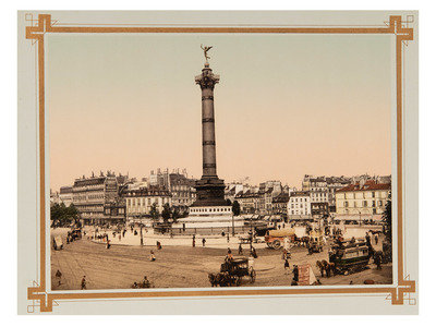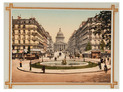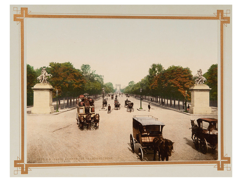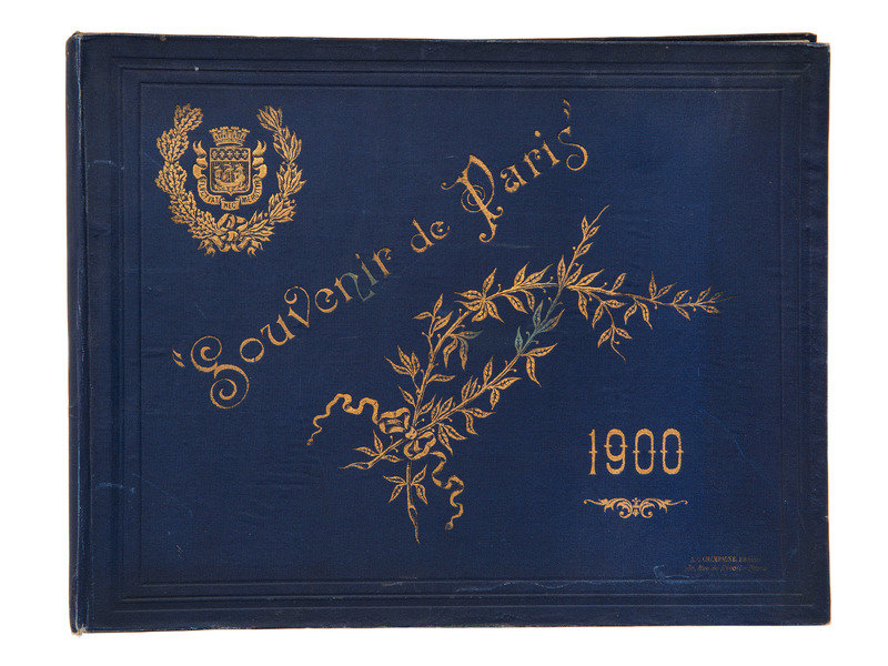 Souvenir de Paris. Paris: A.G., Champagne, 1900. Obl. 11 x 14 in. blue cloth with gilt front. Twelve approx. 6.5 x 9 in. color photographs (polychromes) of the “important sights” of Paris: Notre Dame; La Madeleine; Rue Soufflot; Dome des Invalides; Tombeau de Napoleon; L’Arc de Triomphe de L‘Etoile; Place de la Concorde; Place de la Bastille; Hotel de Ville; Avenue des Champs Elysees; Le Louvre; L‘Opera. (Slight darkening along page edges, otherwise excellent.)