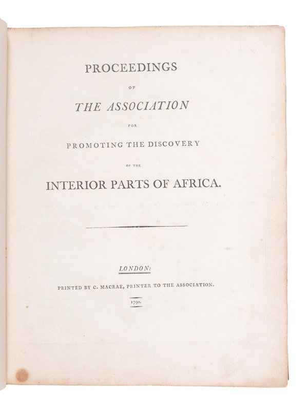 Proceedings of the Association for Promoting the Discovery of the Interior Parts of Africa. London: C. Macrae, 1790. 4to (225 x 281 mm). List of members. (Lacking engraved map, minor toning at edges.) Modern tan calf, spine in 6 compartments with 5 raised bands gilt (minor scuffs). FIRST EDITION account of the travels of John Ledyard and William Lucas as well as an explanation of the creation of their map.