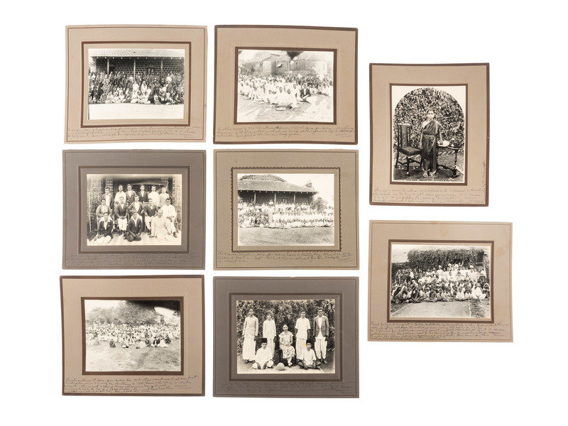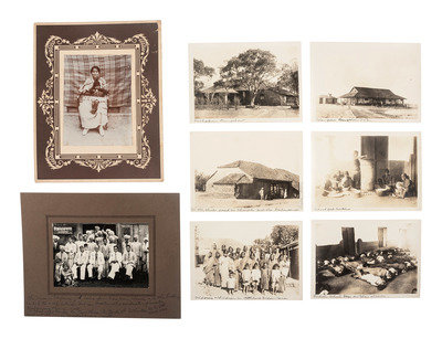 Early 20th Century Photographs of a Christian Mission School in India. Lot of 40 photographs from a Christian Mission school located in Islampur, India in the 1930s. At least 8 of the photographs were taken by and are marked by B.T. Thombare/ Kolhapurkar, Photographar(sic). Images include two 8 x 5.5 in. of a missionary posing on a porch with groups of Indian women; an 8 x 10 in. photograph of a woman and her child on a decorative mount; 8 mounted photographs of large groups of people at a variety of events at the mission measuring 8 x 6 in. (sight) and 12 x 10 in. with their mounts; as well as 20 smaller images of scene and people around India.